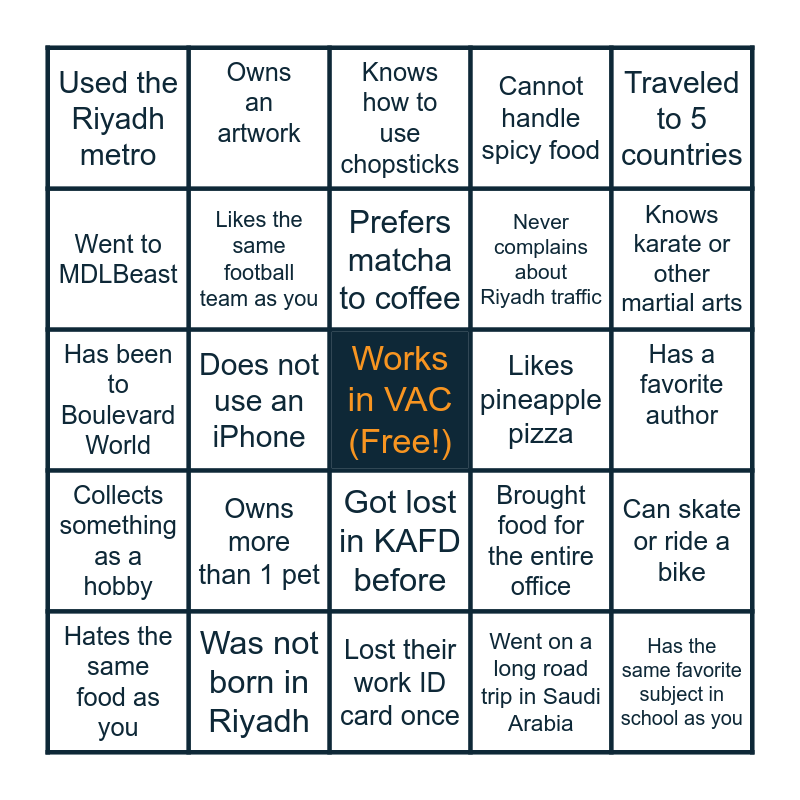 This bingo card has a free space and 24 words: Owns more than 1 pet, Was not born in Riyadh, Prefers matcha to coffee, Hates the same food as you, Traveled to 5 countries, Used the Riyadh metro, Went to MDLBeast, Owns an artwork, Likes pineapple pizza, Got lost in KAFD before, Never complains about Riyadh traffic, Has been to Boulevard World, Brought food for the entire office, Can skate or ride a bike, Likes the same football team as you, Went on a long road trip in Saudi Arabia, Has a favorite author, Knows how to use chopsticks, Knows karate or other martial arts, Does not use an iPhone, Has the same favorite subject in school as you, Collects something as a hobby, Cannot handle spicy food and Lost their work ID card once.