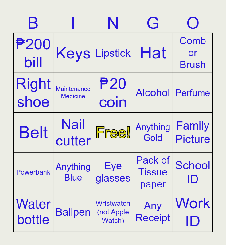 This bingo card has a free space and 24 words: Anything Blue, Ballpen, ₱20 coin, Water bottle, Comb or Brush, ₱200 bill, Right shoe, Keys, Anything Gold, Eye glasses, Alcohol, Belt, Pack of Tissue paper, School ID, Maintenance Medicine, Any Receipt, Family Picture, Lipstick, Perfume, Nail cutter, Work ID, Powerbank, Hat and Wristwatch (not Apple Watch).