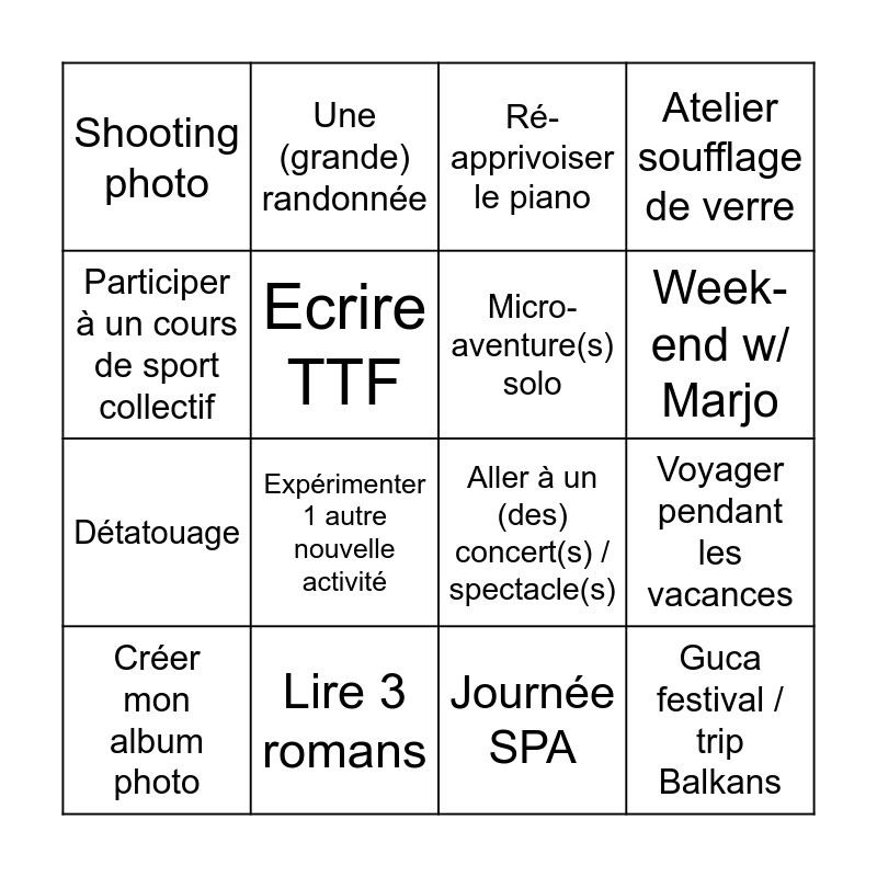 This bingo card has 16 words: Lire 3 romans, Voyager pendant les vacances, Ré-apprivoiser le piano, Shooting photo, Détatouage, Une (grande) randonnée, Aller à un (des) concert(s) / spectacle(s), Journée SPA, Participer à un cours de sport collectif, Ecrire TTF, Créer mon album photo, Atelier soufflage de verre, Expérimenter 1 autre nouvelle activité, Week-end w/ Marjo, Micro-aventure(s) solo and Guca festival / trip Balkans.