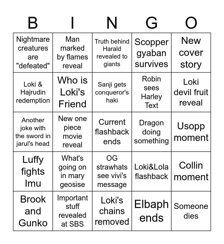 This bingo card has 25 words: Luffy fights Imu, Important stuff revealed at SBS, Current flashback ends, Elbaph ends, New cover story, Nightmare creatures are "defeated", Man marked by flames reveal, Truth behind Harald revealed to giants, Dragon doing something, Collin moment, Loki & Hajrudin redemption, Who is Loki's Friend, Loki's chains removed, Loki&Lola flashback, Loki devil fruit reveal, Brook and Gunko, New one piece movie reveal, Sanji gets conqueror's haki, Robin sees Harley Text, Usopp moment, Another joke with the sword in jarul's head, What's going on in mary geosise, OG strawhats see vivi's message, Scopper gyaban survives and Someone dies.