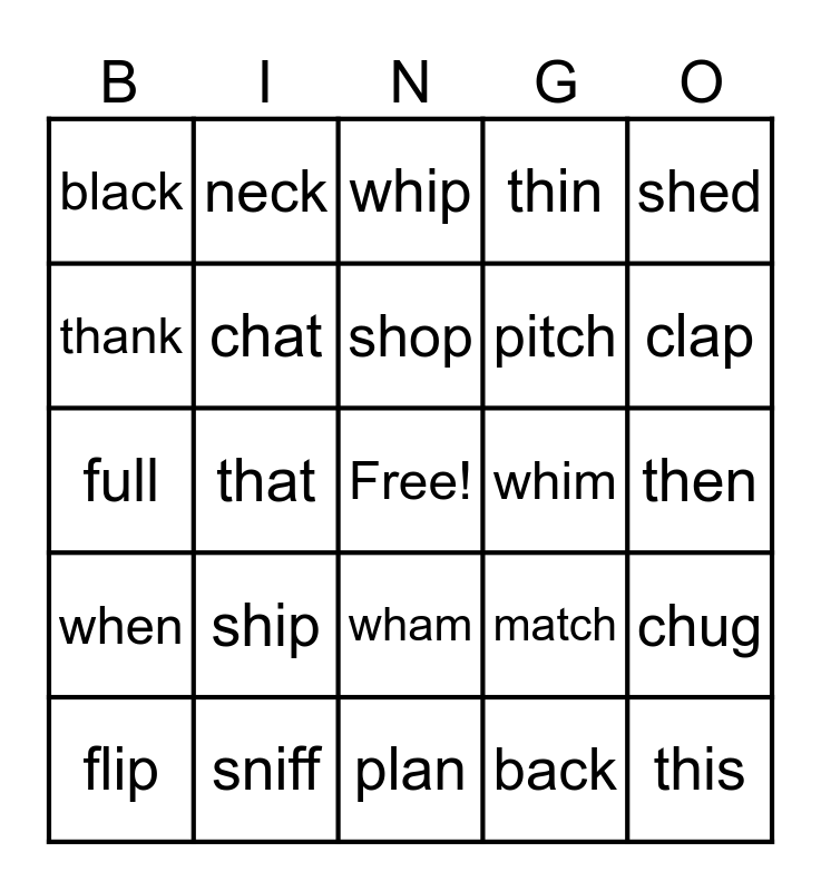 This bingo card has a free space and 37 words: chip, chap, chin, chat, chug, ship, shop, shut, shed, shot, that, thin, this, then, thank, when, what, whip, wham, whim, black, clap, flip, plan, brag, back, neck, stick, lock, grass, sell, sniff, full, catch, match, pitch and clutch.