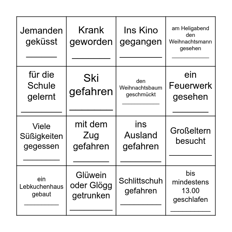 This bingo card has 16 words: Glüwein oder Glögg getrunken _________, Großeltern besucht _________, Ins Kino gegangen ________, Jemanden geküsst ______, Viele Süßigkeiten gegessen ________, Krank geworden _______, ins Ausland gefahren ________, Schlittschuh gefahren _________, für die Schule gelernt ________, Ski gefahren _______, ein Lebkuchenhaus gebaut __________, am Heligabend den Weihnachtsmann gesehen ____________, mit dem Zug gefahren _______, ein Feuerwerk gesehen _______, den Weihnachtsbaum geschmückt ____________ and bis mindestens 13.00 geschlafen __________.