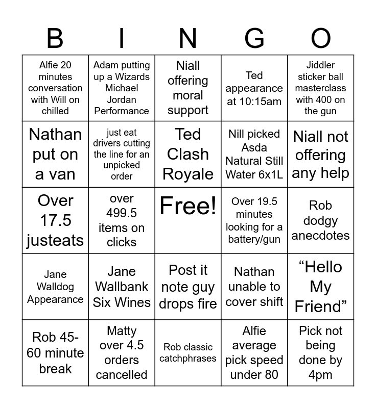 This bingo card has a free space and 24 words: Jane Wallbank Six Wines, Matty over 4.5 orders cancelled, Ted Clash Royale, Rob 45-60 minute break, Jiddler sticker ball masterclass with 400 on the gun, Alfie 20 minutes conversation with Will on chilled, Nathan put on a van, Adam putting up a Wizards Michael Jordan Performance, Over 19.5 minutes looking for a battery/gun, Post it note guy drops fire, Nill picked Asda Natural Still Water 6x1L, Over 17.5 justeats, Nathan unable to cover shift, “Hello My Friend”, just eat drivers cutting the line for an unpicked order, Alfie average pick speed under 80, Rob dodgy anecdotes, Niall offering moral support, Niall not offering any help, over 499.5 items on clicks, Pick not being done by 4pm, Jane Walldog Appearance, Ted appearance at 10:15am and Rob classic catchphrases.