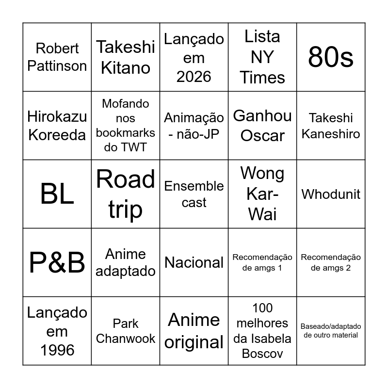 This bingo card has 25 words: Anime adaptado, Anime original, Animação - não-JP, Lançado em 1996, 80s, Robert Pattinson, Hirokazu Koreeda, Takeshi Kitano, Wong Kar-Wai, Nacional, Ganhou Oscar, BL, Recomendação de amgs 1, Recomendação de amgs 2, Mofando nos bookmarks do TWT, Baseado/adaptado de outro material, Whodunit, Lançado em 2026, Takeshi Kaneshiro, Road trip, Ensemble cast, Park Chanwook, P&B, Lista NY Times and 100 melhores da Isabela Boscov.