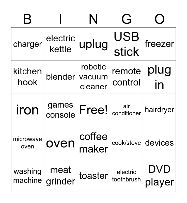 This bingo card has a free space and 24 words: oven, meat grinder, robotic vacuum cleaner, washing machine, freezer, charger, kitchen hook, electric kettle, air conditioner, coffee maker, remote control, iron, cook/stove, devices, blender, electric toothbrush, hairdryer, uplug, plug in, games console, DVD player, microwave oven, USB stick and toaster.