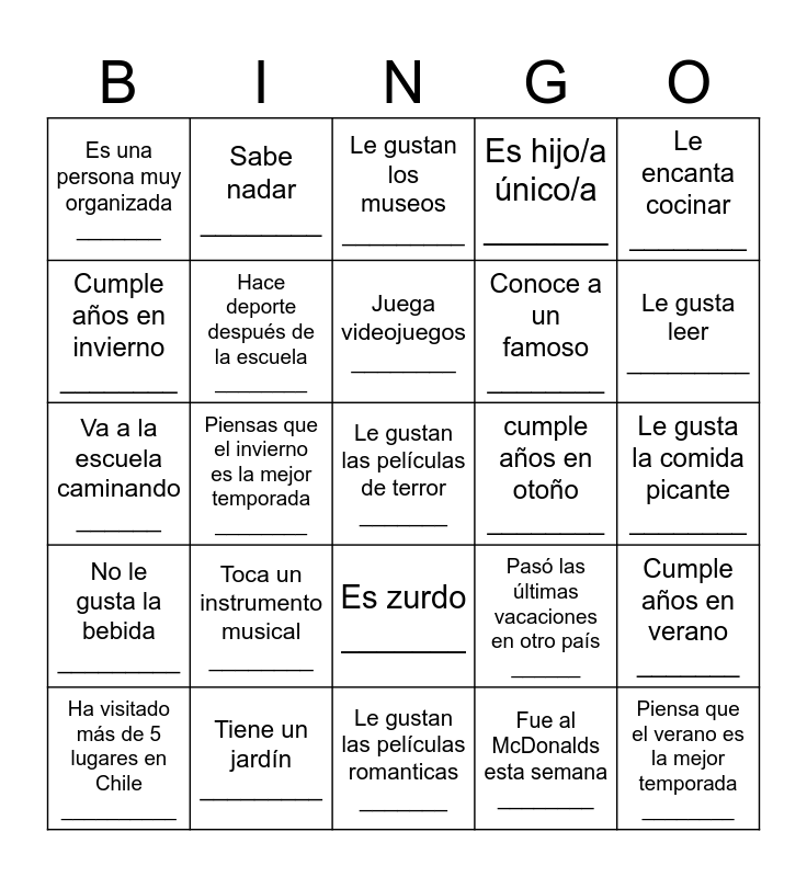 This bingo card has a free space and 24 words: Toca un instrumento musical ________, Tiene un jardín _________, Juega videojuegos ________, Ha visitado más de 5 lugares en Chile __________, Le encanta cocinar ________, Es una persona muy organizada _______, Cumple años en invierno ________, Sabe nadar ________, cumple años en otoño ________, Es zurdo _______, Conoce a un famoso ________, Va a la escuela caminando ______, Pasó las últimas vacaciones en otro país ______, Cumple años en verano _______, Hace deporte después de la escuela ________, Fue al McDonalds esta semana ________, Le gusta la comida picante ________, Le gustan los museos _________, Le gusta leer _________, Piensas que el invierno es la mejor temporada ________, Piensa que el verano es la mejor temporada ________, No le gusta la bebida _________, Es hijo/a único/a _______ and Le gustan las películas romanticas _______.