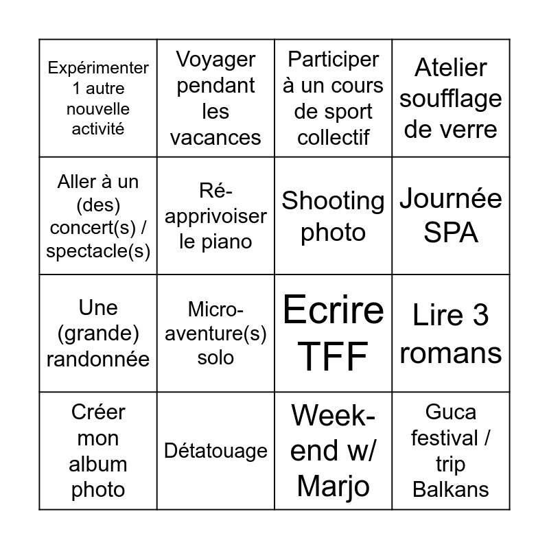 This bingo card has 16 words: Détatouage, Lire 3 romans, Participer à un cours de sport collectif, Expérimenter 1 autre nouvelle activité, Une (grande) randonnée, Voyager pendant les vacances, Ecrire TFF, Week-end w/ Marjo, Aller à un (des) concert(s) / spectacle(s), Ré-apprivoiser le piano, Créer mon album photo, Atelier soufflage de verre, Micro-aventure(s) solo, Journée SPA, Shooting photo and Guca festival / trip Balkans.