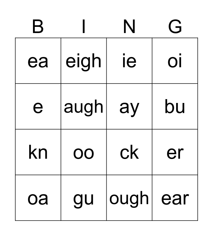 This bingo card has 25 words: Free!, ai, bu, ch, e, ea, augh, eigh, gu, gn, kn, ck, dge, ee, ay, ow, ough, ie, oo, er, oa, oy, ear, oi and ng.