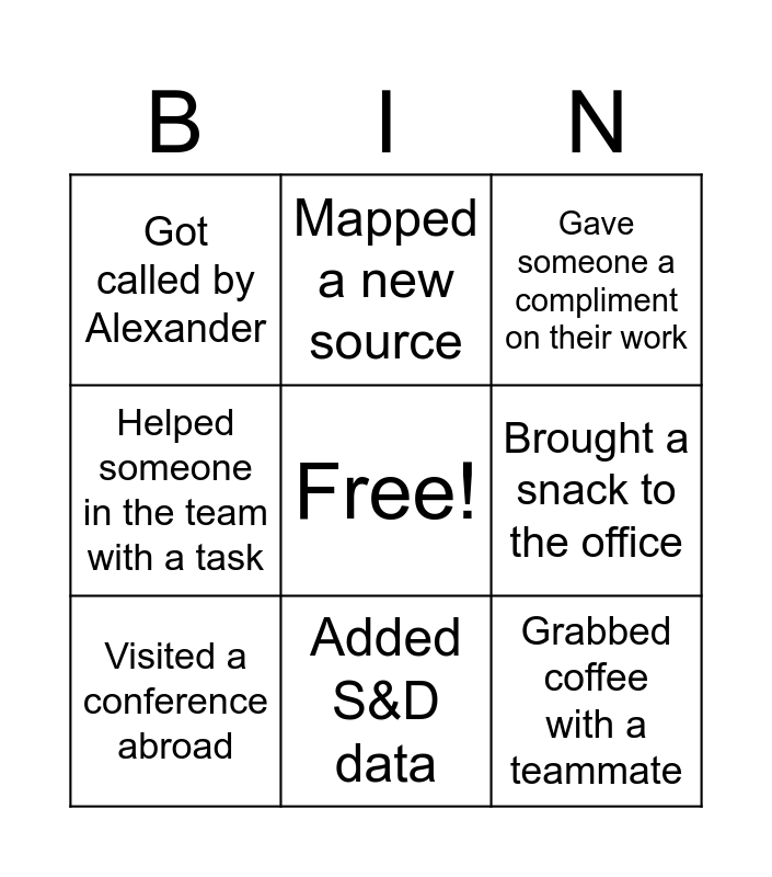 This bingo card has a free space and 8 words: Brought a snack to the office, Gave someone a compliment on their work, Mapped a new source, Visited a conference abroad, Got called by Alexander, Grabbed coffee with a teammate, Helped someone in the team with a task and Added S&D data.