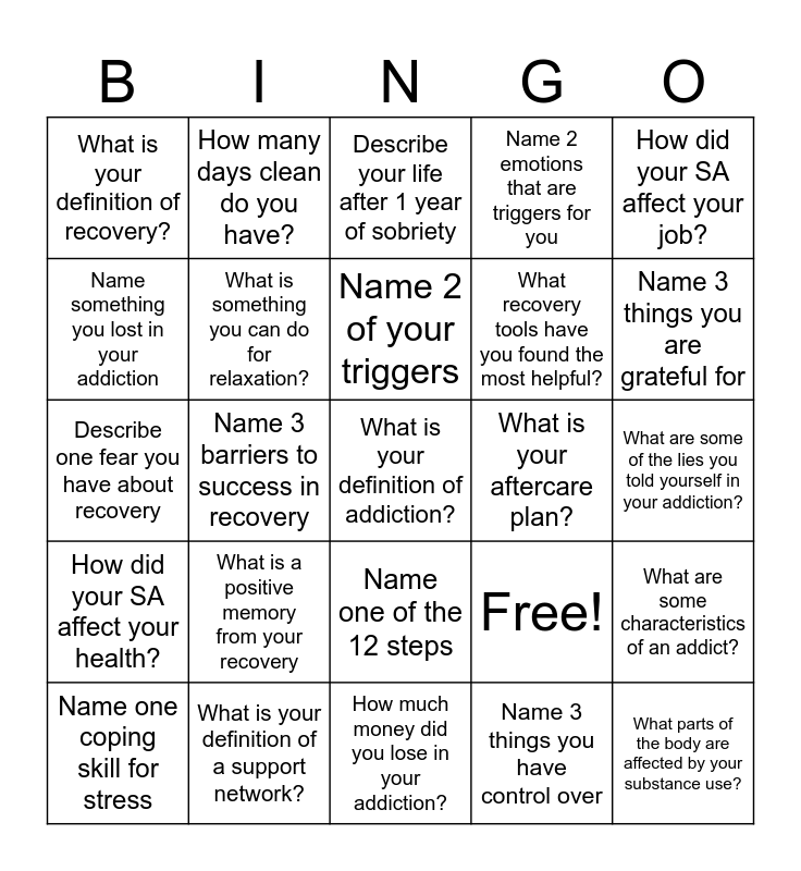 This bingo card has 25 words: What is a positive memory from your recovery, How much money did you lose in your addiction?, Name 2 of your triggers, Name one coping skill for stress, How did your SA affect your job?, What is your definition of recovery?, Name something you lost in your addiction, How many days clean do you have?, What is your aftercare plan?, Name one of the 12 steps, What recovery tools have you found the most helpful?, Describe one fear you have about recovery, Free!, What are some characteristics of an addict?, What is something you can do for relaxation?, What parts of the body are affected by your substance use?, What are some of the lies you told yourself in your addiction?, Describe your life after 1 year of sobriety, Name 3 things you are grateful for, Name 3 barriers to success in recovery, What is your definition of addiction?, What is your definition of a support network?, How did your SA affect your health?, Name 2 emotions that are triggers for you and Name 3 things you have control over.