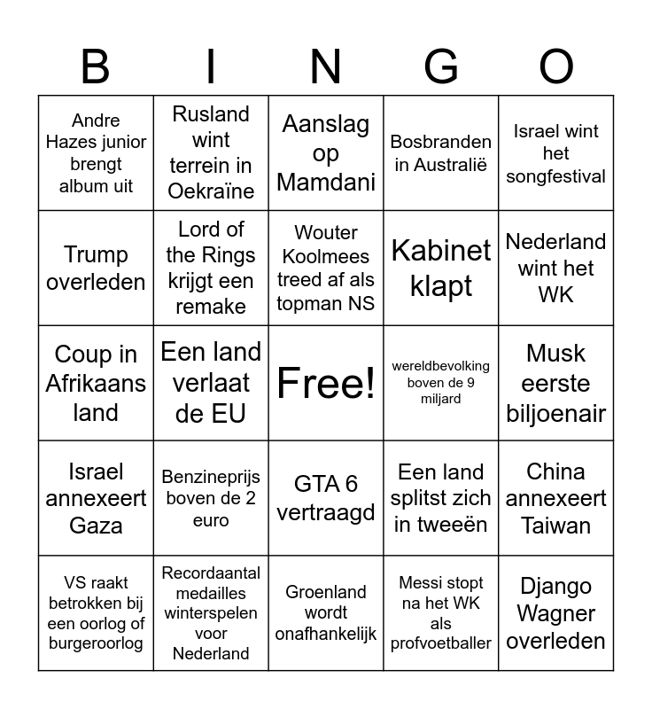 This bingo card has a free space and 24 words: Benzineprijs boven de 2 euro, Recordaantal medailles winterspelen voor Nederland, Wouter Koolmees treed af als topman NS, VS raakt betrokken bij een oorlog of burgeroorlog, Israel wint het songfestival, Andre Hazes junior brengt album uit, Trump overleden, Rusland wint terrein in Oekraïne, wereldbevolking boven de 9 miljard, GTA 6 vertraagd, Kabinet klapt, Coup in Afrikaans land, Een land splitst zich in tweeën, China annexeert Taiwan, Lord of the Rings krijgt een remake, Messi stopt na het WK als profvoetballer, Musk eerste biljoenair, Aanslag op Mamdani, Nederland wint het WK, Een land verlaat de EU, Django Wagner overleden, Israel annexeert Gaza, Bosbranden in Australië and Groenland wordt onafhankelijk.