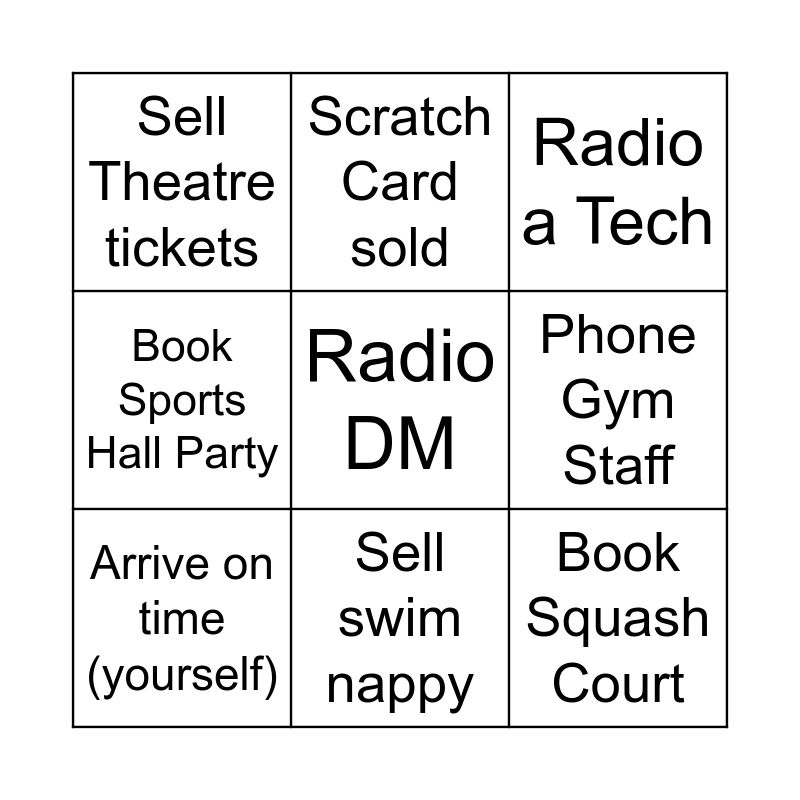 This bingo card has 65 words: Customer 50p Denial, Customer 50p Accepted, Make customer laugh, Give change <10p, Email another CRA, Open door for someone, Scratch Card sold, Scratch Card exchanged, Sell swim nappy, Sell bathers, Sell goggles, Radio Centre One, Radio Cleaner, Radio DM, Phone Swim School, Phone Gym Staff, Phone PW, PW or JJ, Sell Theatre tickets, Book Sports Hall, Book Squash Court, Book Outdoor Sport, Book Swim Party, Book Sports Hall Party, Do a fast track, Gym Staff does fast track, Check Lost Property for Customer, Provide Hire Equipment, Restock Zoggs Bather, New/Renew DD membership, New/Renew Weekly Pass, New/Renew Month Membership, Replace till roll, Replace kiosk till roll, Cafe item sold, Drink sold, Give directions, Tour of Centre, Use main float, Cafe uses main float, Serve a Staff Member, Arrive on time (yourself), Resolve Arrears, New/Renew Annual Membership, Arrive on time (your colleague), Cash Up balances (yourself), Receive lost item, Log something on SharePoint, Resolve 1x BSJ inbox, Phone someone on Waiting List, Radio Gym Staff, Lost Property Collected, Issue Squash Token, Radio for Emergency, Give Health Suite Wristband, Give Teen Gym Wristband, Issue Family Swim Ticket, Issue Under 5 Swim Ticket, Radio a Tech, Tell Customer Wifi Password, Take Customer Photo, Phone Active Health, Sign Out/In Squash Keys, Sign Out/In HLC Key, Give out Brochures / Forms and DD Form Cancel or Freeze.