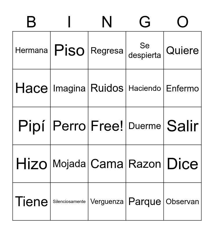 This bingo card has a free space and 44 words: Bicicletas, Observan, Recoge, Tiene, Collar, Parque, Regresa, Inspeccionan, Quiere, Silenciosamente, Se despierta, Duerme, Cama, Mojada, Hace ruidos, Verguenza, Fortaleza, Pipí, Popó, Enfermo, Piso, Ventana, Regalo, Hermana, Mascota, Salir, Doctor, Cama, Razon, Hizo, Telefono, Dice, Perrito, Ir, Perro, Dormitorio, Solo, Pasa, Ruidos, Hace, Haciendo, Mucha, Imagina and Dia.