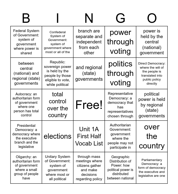 This bingo card has a free space and 26 words: Unit 1A First Half Vocab List, Geographic Distribution of Power: how political power is distributed between national, and regional (state) governments, Unitary System of Government: system of government where most or all political, power is held by the central (national) government, Federal System of Government: system of government where power is shared, between central (national) and regional (state) governments, Confederal System of Government: system of government where most or all of the, political power is held by regional (state) governments, Authoritarian Government: government where the people may not participate in, politics through voting, Autocracy: an authoritarian form of government where one person has total control, over the country, Oligarchy: an authoritarian form of government where a small group of people have, total control over the country, Democracy: a form of government where power lies with the people, who exercise that, power through voting, Presidential Democracy: a democracy where the executive branch and the legislative, branch are separate and independent from each other, Parliamentary Democracy: a form of democracy the executive and legislative are one, Direct Democracy: where the will of the people is translated into public policy directly, through mass meetings where citizens gather and make decisions regarding policy, Representative Democracy: a democracy that has representatives chosen through, elections, Republic: sovereign power is held by the people by those eligible to vote, while political and power is held by the elected representatives.