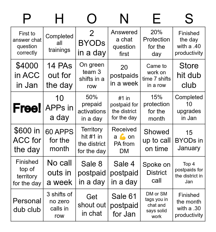This bingo card has 36 words: Sale 4 postpaid in a day, Sale 8 postpaid in a day, Sale 61 postpaid for Jan, $4000 in ACC in Jan, $600 in ACC for the day, #1 in postpaid for the district for the day, 14 PAs out for the day, Get shout out in chat, 20% Protection for the day, Spoke on District call, Store hit dub club, Answered a chat question first, Top 4 postpaids for the district in Jan, 10 APPs in a day, 20 postpaids in a week, First to answer chat question correctly, Finished top of territory for the day, 15% protection for the month, Free!, 2 BYODs in a day, 50% prepaid activations in a day, 60 APPS for the month, Received a 💪 on PA from DM, Territory hit #1 in the district for the day, Showed up to call on time, Completed all trainings, Came to work on time 7 shifts in a row, 3 shifts of no zero calls in row, On green team 3 shifts in a row, Finished the day with a .40 productivity, Finished the month with a .30 productivity, Personal dub club, 15 BYODs in January, Completed 10 upgrades in Jan, No call outs in a week and DM or SM tags you in chat and says solid work.