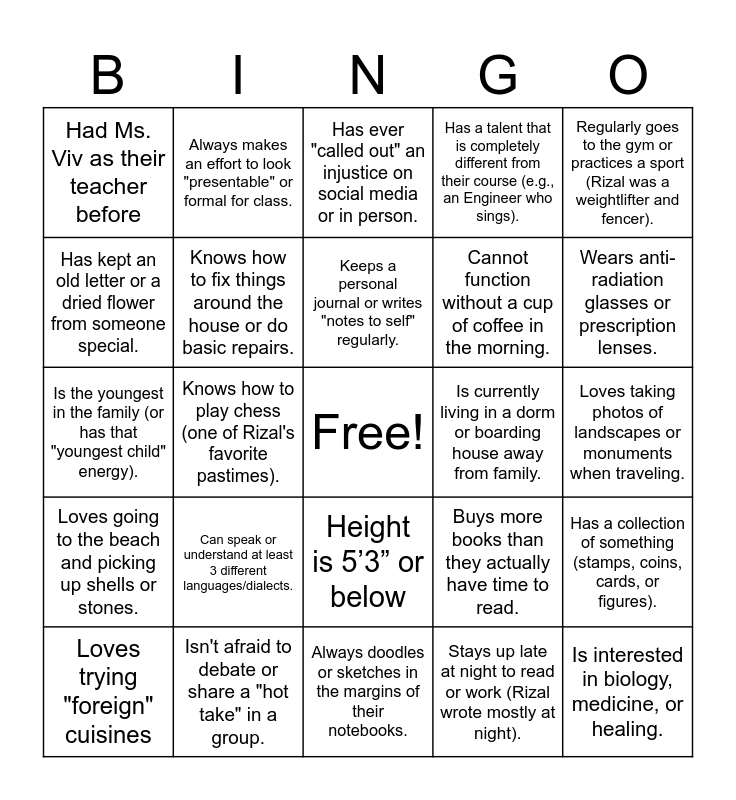 This bingo card has a free space and 25 words: Can speak or understand at least 3 different languages/dialects., Always doodles or sketches in the margins of their notebooks., Keeps a personal journal or writes "notes to self" regularly., Loves trying "foreign" cuisines, Regularly goes to the gym or practices a sport (Rizal was a weightlifter and fencer)., Had Ms. Viv as their teacher before, Has kept an old letter or a dried flower from someone special., Always makes an effort to look "presentable" or formal for class., Is currently living in a dorm or boarding house away from family., Height is 5’3” or below, Cannot function without a cup of coffee in the morning., Is the youngest in the family (or has that "youngest child" energy)., Buys more books than they actually have time to read., Has a collection of something (stamps, coins, cards, or figures)., Knows how to fix things around the house or do basic repairs., Has a pet dog, Loves taking photos of landscapes or monuments when traveling., Has ever "called out" an injustice on social media or in person., Wears anti-radiation glasses or prescription lenses., Knows how to play chess (one of Rizal's favorite pastimes)., Is interested in biology, medicine, or healing., Isn't afraid to debate or share a "hot take" in a group., Loves going to the beach and picking up shells or stones., Has a talent that is completely different from their course (e.g., an Engineer who sings). and Stays up late at night to read or work (Rizal wrote mostly at night)..