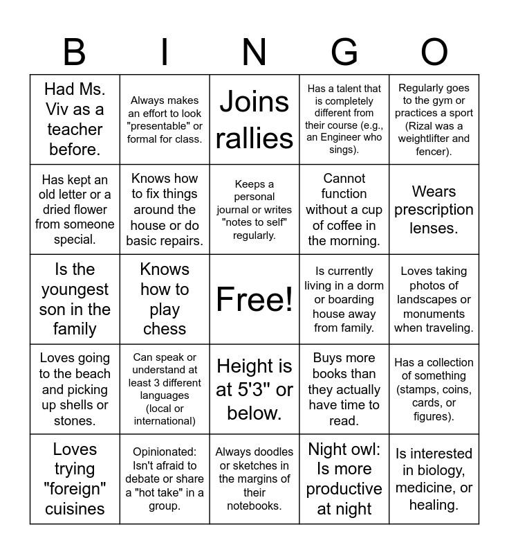 This bingo card has a free space and 25 words: Can speak or understand at least 3 different languages (local or international), Always doodles or sketches in the margins of their notebooks., Keeps a personal journal or writes "notes to self" regularly., Loves trying "foreign" cuisines, Regularly goes to the gym or practices a sport (Rizal was a weightlifter and fencer)., Had Ms. Viv as a teacher before., Has kept an old letter or a dried flower from someone special., Always makes an effort to look "presentable" or formal for class., Is currently living in a dorm or boarding house away from family., Height is at 5'3'' or below., Cannot function without a cup of coffee in the morning., Is the youngest son in the family, Buys more books than they actually have time to read., Has a collection of something (stamps, coins, cards, or figures)., Knows how to fix things around the house or do basic repairs., Has a pet dog, Loves taking photos of landscapes or monuments when traveling., Joins rallies, Wears prescription lenses., Knows how to play chess, Is interested in biology, medicine, or healing., Opinionated: Isn't afraid to debate or share a "hot take" in a group., Loves going to the beach and picking up shells or stones., Has a talent that is completely different from their course (e.g., an Engineer who sings). and Night owl: Is more productive at night.