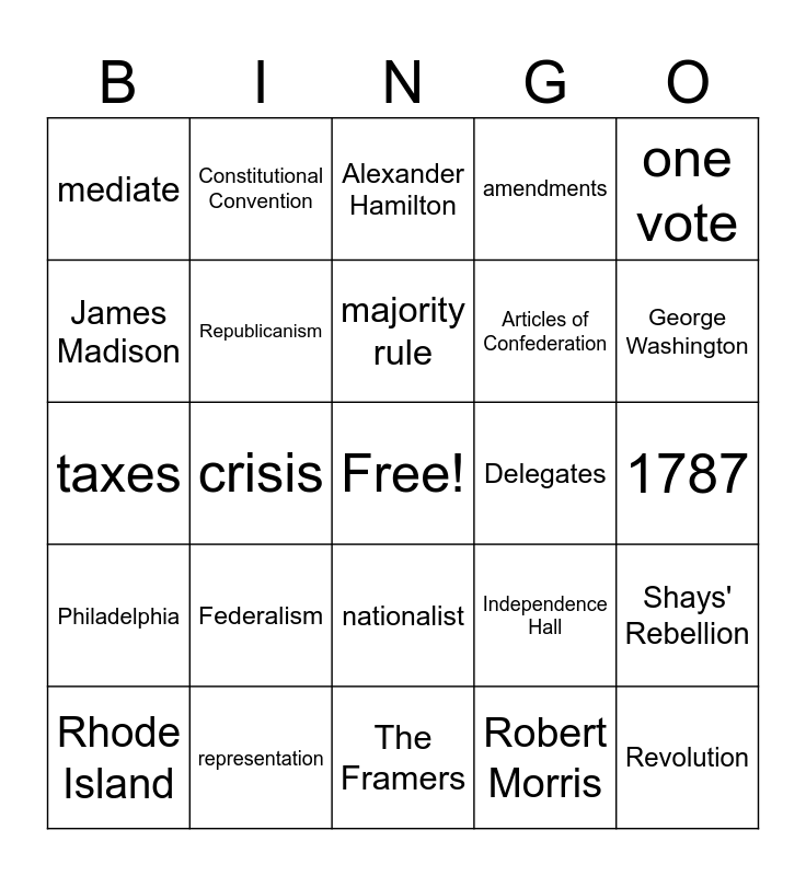 This bingo card has a free space and 28 words: Shays' Rebellion, weak central government, Articles of Confederation, Robert Morris, James Madison, Alexander Hamilton, Constitutional Convention, Philadelphia, Delegates, Rhode Island, taxes, amendments, representation, The Framers, George Washington, Benjamin Franklin, Federalism, Republicanism, majority rule, nationalist, mediate, credibility, Revolution, crisis, 1787, Independence Hall, one vote and reform.