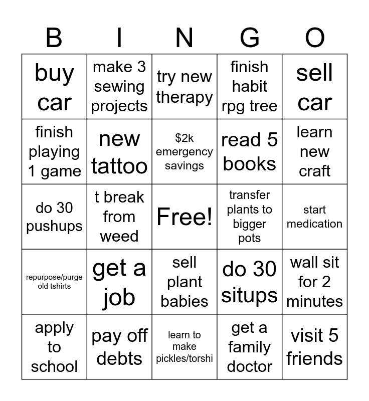 This bingo card has a free space and 24 words: get a job, pay off debts, $2k emergency savings, apply to school, sell car, buy car, finish playing 1 game, make 3 sewing projects, transfer plants to bigger pots, sell plant babies, read 5 books, do 30 pushups, do 30 situps, wall sit for 2 minutes, new tattoo, get a family doctor, start medication, try new therapy, learn new craft, t break from weed, visit 5 friends, repurpose/purge old tshirts, finish habit rpg tree and learn to make pickles/torshi.