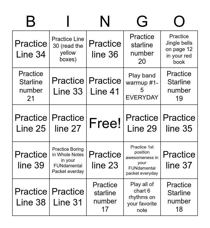 This bingo card has a free space and 24 words: Practice Boring in Whole Notes in your FUNdamental Packet everday, Practice Line 31, Practice Line 41, Practice Line 38, Practice Jingle bells on page 12 in your red book, Practice Line 34, Practice Starline number 21, Practice Line 30 (read the yellow boxes), Practice Line 29, Practice line 23, Play band warmup #1-5 EVERYDAY, Practice Line 25, Practice 1st position awesomeness in your FUNdamental packet everyday, Practice line 37, Practice Line 33, Play all of chart 6 rhythms on your favorite note, Practice line 35, Practice line 36, Practice Starline number 19, Practice line 27, Practice Starline number 18, Practice line 39, Practice starline number 20 and Practice starline number 17.