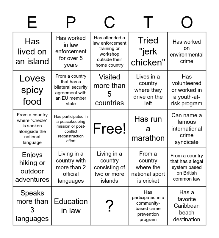 This bingo card has a free space and 24 words: Living in a country with more than 2 official languages, Education in law, Visited more than 5 countries, Speaks more than 3 languages, Has worked on environmental crime, Has lived on an island, Loves spicy food, Has worked in law enforcement for over 5 years, Has run a marathon, Living in a country consisting of two or more islands, Lives in a country where they drive on the left, From a country where "Creole" is spoken alongside the national language, From a country where the national sport is cricket, From a country that has a legal system based on British common law, From a country that has a bilateral security agreement with an EU member state, Has participated in a community-based crime prevention program, Can name a famous international crime syndicate, Has attended a law enforcement training or workshop outside their home country, Has volunteered or worked in a youth-at-risk program, Has participated in a peacekeeping mission or post-conflict reconstruction effort, Has a favorite Caribbean beach destination, Enjoys hiking or outdoor adventures, Tried "jerk chicken" and ?.