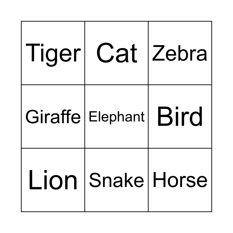 This bingo card has 9 words: Lion, Zebra, Cat, Giraffe, Tiger, Bird, Elephant, Horse and Snake.