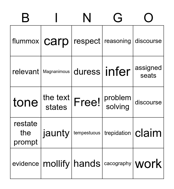 This bingo card has a free space and 26 words: tempestuous, cacography, duress, mollify, discourse, flummox, relevant, carp, discourse, trepidation, infer, tone, claim, evidence, the text states, this is significant because, reasoning, restate the prompt, respect, work, assigned seats, hands, problem solving, jaunty, Magnanimous and wise mind.