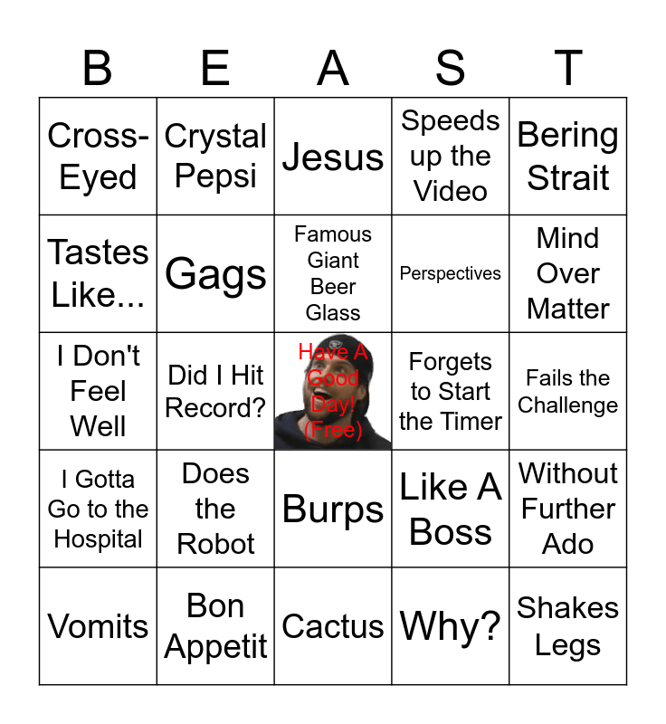 This bingo card has a free space and 24 words: Does the Robot, Bon Appetit, Famous Giant Beer Glass, Vomits, Bering Strait, Cross-Eyed, Tastes Like..., Crystal Pepsi, Forgets to Start the Timer, Burps, Perspectives, I Don't Feel Well, Like A Boss, Without Further Ado, Gags, Why?, Fails the Challenge, Jesus, Mind Over Matter, Did I Hit Record?, Shakes Legs, I Gotta Go to the Hospital, Speeds up the Video and Cactus.