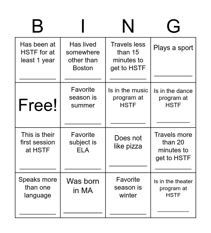 This bingo card has 16 words: Was born in MA _________, Travels more than 20 minutes to get to HSTF __________, Travels less than 15 minutes to get to HSTF __________, Has been at HSTF for at least 1 year __________, This is their first session at HSTF __________, Has lived somewhere other than Boston __________, Does not like pizza __________, Favorite season is winter __________, Free!, Favorite season is summer __________, Speaks more than one language __________, Plays a sport __________, Favorite subject is ELA __________, Is in the dance program at HSTF __________, Is in the music program at HSTF __________ and Is in the theater program at HSTF __________.