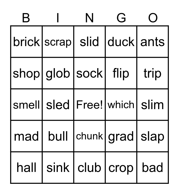 This bingo card has a free space and 24 words: bull, sink, sock, hall, ants, brick, shop, scrap, which, chunk, flip, smell, grad, slap, glob, crop, slim, slid, trip, sled, bad, mad, duck and club.