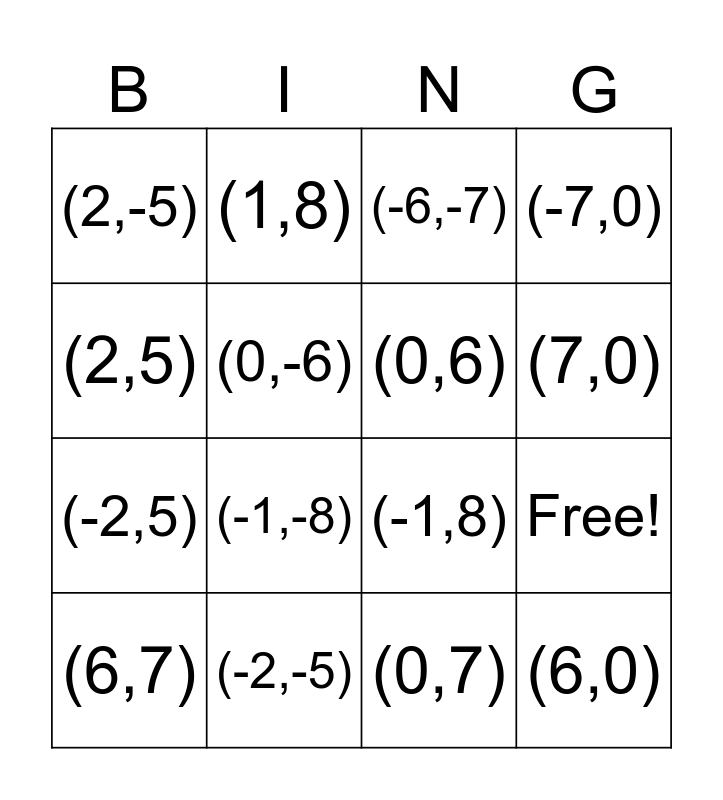 This bingo card has 20 words: Free!, (6,-7), (-6,-7), (-6,7), (6,7), (2,5), (-2,-5), (2,-5), (-2,5), (1,8), (-1,-8), (-1,8), (0,-6), (6,0), (0,6), (-6,0), (7,0), (-7,0), (0,7) and (0,-7).