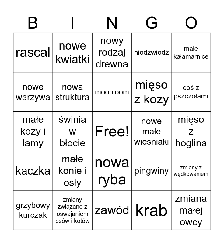 This bingo card has a free space and 24 words: małe konie i osły, zmiany związane z oswajaniem psów i kotów, moobloom, grzybowy kurczak, małe kałamarnice, rascal, nowe warzywa, nowe kwiatki, nowe małe wieśniaki, nowa ryba, mięso z kozy, małe kozy i lamy, pingwiny, zmiany z wędkowaniem, nowa struktura, krab, mięso z hoglina, nowy rodzaj drewna, coś z pszczołami, świnia w błocie, zmiana małej owcy, kaczka, niedźwiedź and zawód.