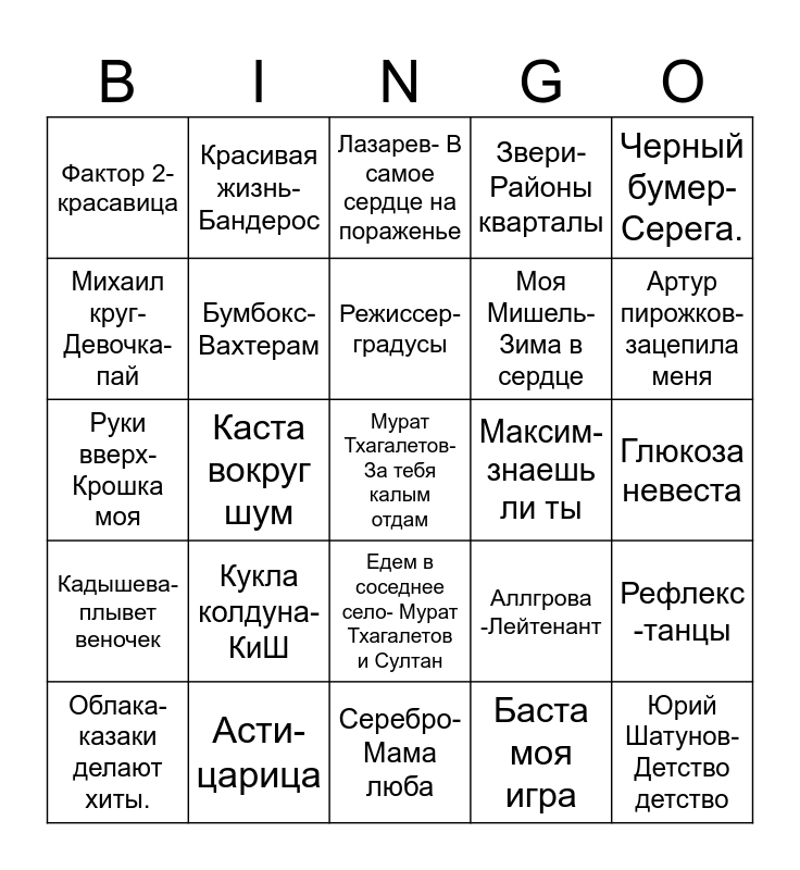 This bingo card has 27 words: Аллгрова -Лейтенант, Юрий Шатунов- Детство детство, Моя Мишель- Зима в сердце, Серебро- Мама люба, Михаил круг- Девочка-пай, Лазарев- В самое сердце на пораженье, Красивая жизнь- Бандерос, Кадышева- плывет веночек, Максим- знаешь ли ты, Рефлекс -танцы, Руки вверх- Крошка моя, Звери- Районы кварталы, Облака- казаки делают хиты., Асти- царица, Артур пирожков-зацепила меня, Асти -По барам, Бумбокс-Вахтерам, Режиссер-градусы, Кукла колдуна-КиШ, Фактор 2-красавица, Глюкоза невеста, Баста моя игра, Каста вокруг шум, Мурат Тхагалетов-За тебя калым отдам, Едем в соседнее село- Мурат Тхагалетов и Султан, Черный бумер-Серега. and Мало половин -Бузова.