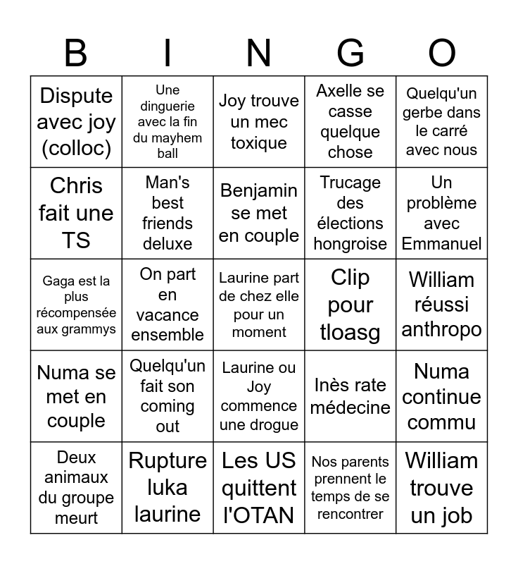 This bingo card has 25 words: Quelqu'un fait son coming out, Les US quittent l'OTAN, Benjamin se met en couple, Deux animaux du groupe meurt, Quelqu'un gerbe dans le carré avec nous, Dispute avec joy (colloc), Chris fait une TS, Une dinguerie avec la fin du mayhem ball, Clip pour tloasg, Laurine ou Joy commence une drogue, Trucage des élections hongroise, Gaga est la plus récompensée aux grammys, Inès rate médecine, Numa continue commu, Man's best friends deluxe, William trouve un job, William réussi anthropo, Joy trouve un mec toxique, Un problème avec Emmanuel, On part en vacance ensemble, Laurine part de chez elle pour un moment, Rupture luka laurine, Numa se met en couple, Axelle se casse quelque chose and Nos parents prennent le temps de se rencontrer.
