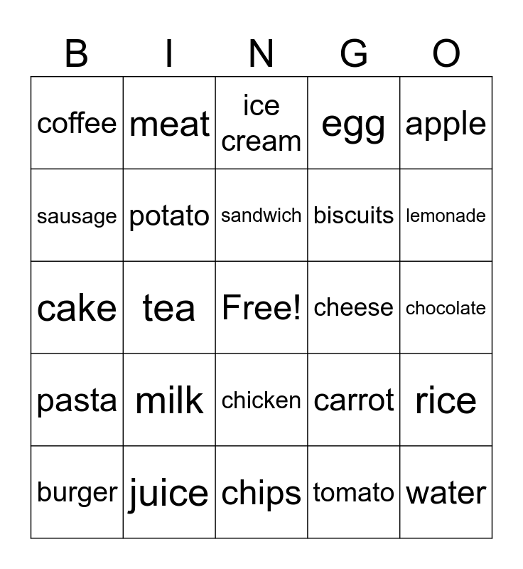 This bingo card has a free space and 24 words: milk, juice, sandwich, burger, apple, coffee, sausage, meat, cheese, chicken, biscuits, cake, carrot, rice, potato, tomato, chocolate, ice cream, lemonade, tea, water, pasta, egg and chips.