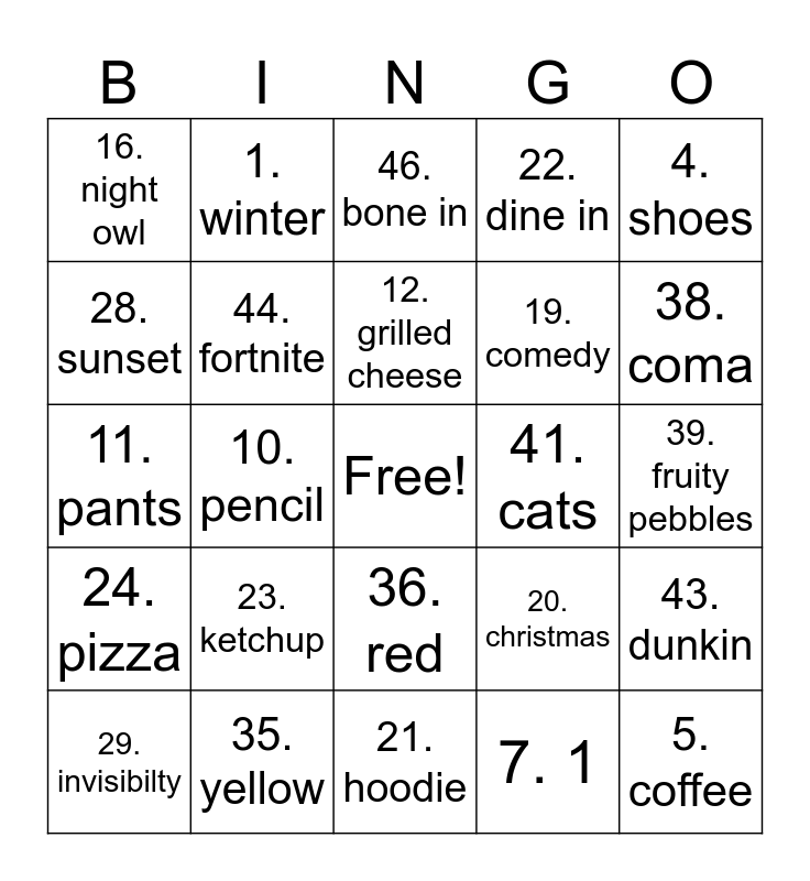 This bingo card has a free space and 24 words: 23. ketchup, 35. yellow, 12. grilled cheese, 29. invisibilty, 4. shoes, 16. night owl, 28. sunset, 1. winter, 41. cats, 36. red, 19. comedy, 11. pants, 20. christmas, 43. dunkin, 44. fortnite, 7. 1, 39. fruity pebbles, 46. bone in, 38. coma, 10. pencil, 5. coffee, 24. pizza, 22. dine in and 21. hoodie.