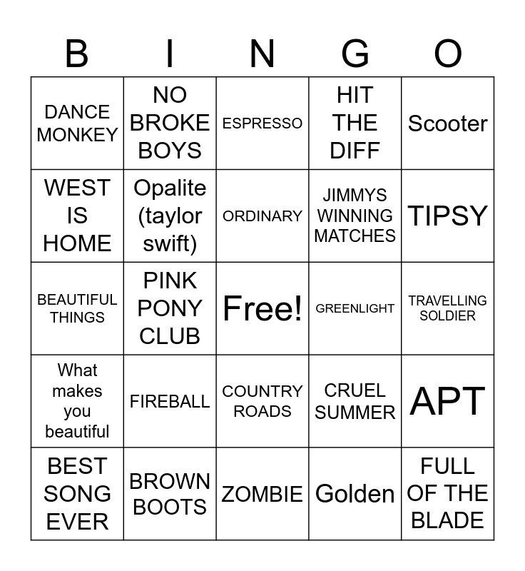 This bingo card has a free space and 34 words: Killeagh, Golden, soda Pop, Summer Dream of love, What makes you beautiful, Opalite (taylor swift), Scooter, BEST SONG EVER, NO BROKE BOYS, THE GLEN, ORDINARY, ESPRESSO, I PLAY FOR COUNTY, THIS IS THE LIFE, GREENLIGHT, TIPSY, BROWN BOOTS, BEAUTIFUL THINGS, FIREBALL, CRUEL SUMMER, COUNTRY ROADS, STICK SEASON, DANCE MONKEY, TRAVELLING SOLDIER, ZOMBIE, FULL OF THE BLADE, HIT THE DIFF, DIAMONDS & ROSES, JIMMYS WINNING MATCHES, WEST IS HOME, ST PATRICK DROVE A HONDA CIVIC, PINK PONY CLUB, APT and GOLDEN.
