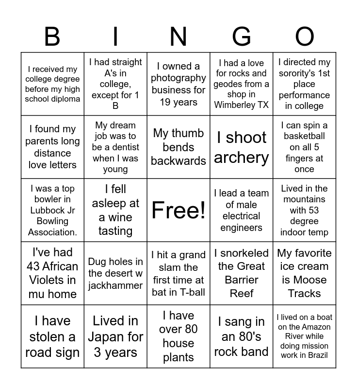 This bingo card has a free space and 24 words: Dug holes in the desert w jackhammer, Lived in Japan for 3 years, My thumb bends backwards, I have stolen a road sign, I directed my sorority's 1st place performance in college, I received my college degree before my high school diploma, I found my parents long distance love letters, I had straight A's in college, except for 1 B, I lead a team of male electrical engineers, I hit a grand slam the first time at bat in T-ball, I shoot archery, I was a top bowler in Lubbock Jr Bowling Association., I snorkeled the Great Barrier Reef, My favorite ice cream is Moose Tracks, My dream job was to be a dentist when I was young, I sang in an 80's rock band, Lived in the mountains with 53 degree indoor temp, I owned a photography business for 19 years, I can spin a basketball on all 5 fingers at once, I fell asleep at a wine tasting, I lived on a boat on the Amazon River while doing mission work in Brazil, I've had 43 African Violets in mu home, I had a love for rocks and geodes from a shop in Wimberley TX and I have over 80 house plants.
