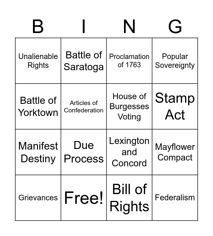 This bingo card has 16 words: Free!, Mayflower Compact, Proclamation of 1763, Unalienable Rights, Manifest Destiny, Battle of Saratoga, Lexington and Concord, Bill of Rights, Battle of Yorktown, Articles of Confederation, Grievances, Popular Sovereignty, Due Process, Stamp Act, House of Burgesses Voting and Federalism.