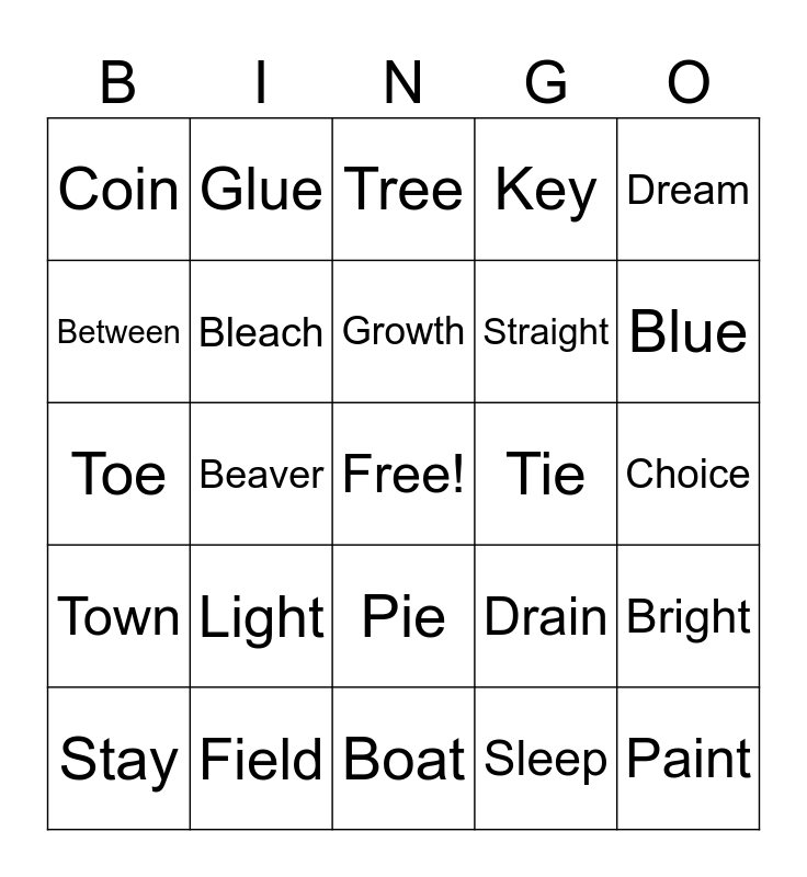 This bingo card has a free space and 45 words: Rain, Paint, Train, Stay, Tray, Sleep, Tree, Beach, Dream, Field, Key, Tie, Pie, Light, High, Boat, Road, Toe, Snow, Blue, Glue, New, Fruit, Coin, House, Choice, Moist, Steam, Drain, Town, Loaf, Bright, Donkey, Suit, Smooth, Beaver, Praise, Ground, Raccoon, Growth, Between, Straight, Speech, Bleach and Fleece.