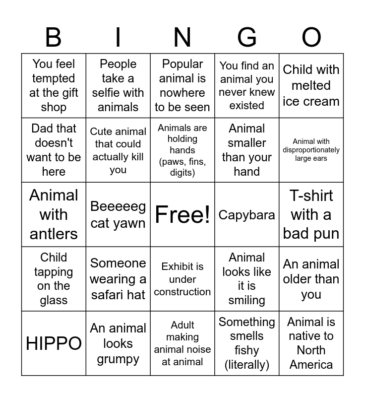 This bingo card has a free space and 24 words: Someone wearing a safari hat, An animal looks grumpy, Animals are holding hands (paws, fins, digits), HIPPO, Child with melted ice cream, You feel tempted at the gift shop, Dad that doesn't want to be here, People take a selfie with animals, Capybara, Exhibit is under construction, Animal smaller than your hand, Animal with antlers, Animal looks like it is smiling, An animal older than you, Cute animal that could actually kill you, Something smells fishy (literally), T-shirt with a bad pun, Popular animal is nowhere to be seen, Animal with disproportionately large ears, Beeeeeg cat yawn, Animal is native to North America, Child tapping on the glass, You find an animal you never knew existed and Adult making animal noise at animal.