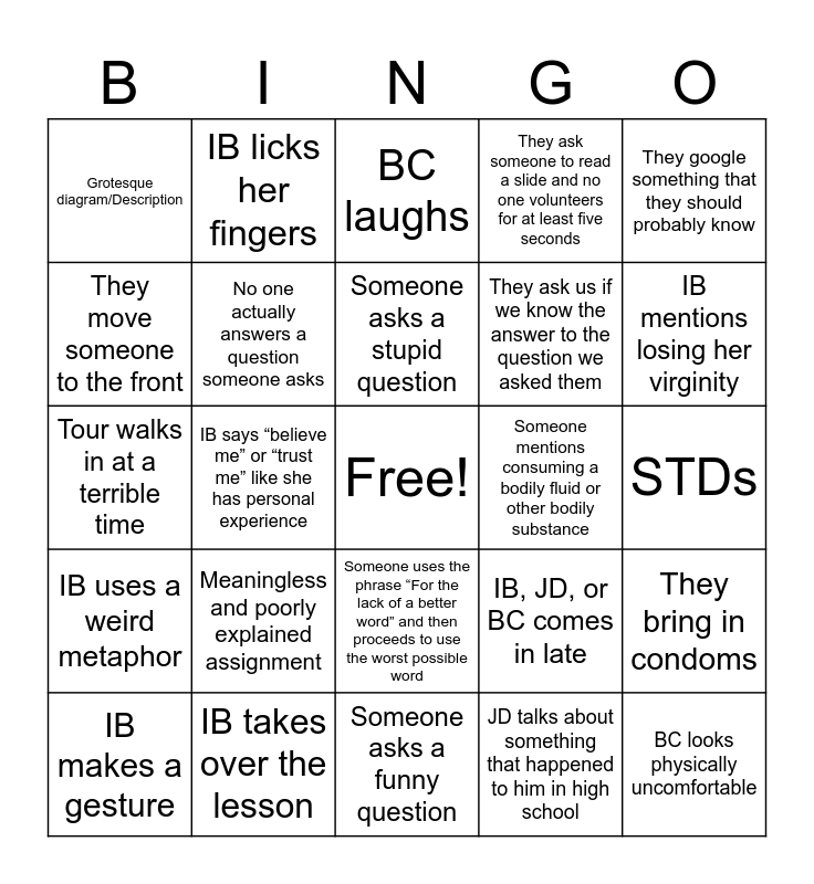 This bingo card has a free space and 34 words: IB mentions someone from her life with a mental health disorder, JD talks about something that happened to him in high school, JD interrupts someone, BC speaks under two times, IB uses a weird metaphor, No one actually answers a question someone asks, They google something that they should probably know, IB makes a gesture, IB licks her fingers, JD goes off topic, Someone asks a stupid question, BC laughs, JD or IB says something that’s just incorrect, Someone has a lunch, Someone mentions consuming a bodily fluid or other bodily substance, IB mentions losing her virginity, IB takes over the lesson, Tour walks in at a terrible time, Meaningless and poorly explained assignment, IB, JD, or BC comes in late, Someone uses the phrase “For the lack of a better word” and then proceeds to use the worst possible word, Fearmongering, Grotesque diagram/Description, STDs, Someone asks a funny question, BC looks physically uncomfortable, They ask someone to read a slide and no one volunteers for at least five seconds, They don’t know someone’s name and they point at them, They ask us if we know the answer to the question we asked them, They move someone to the front, They say they’ll get to something later (they won’t), IB says “believe me” or “trust me” like she has personal experience, They bring in condoms and Callback to a previous comment (write it in).