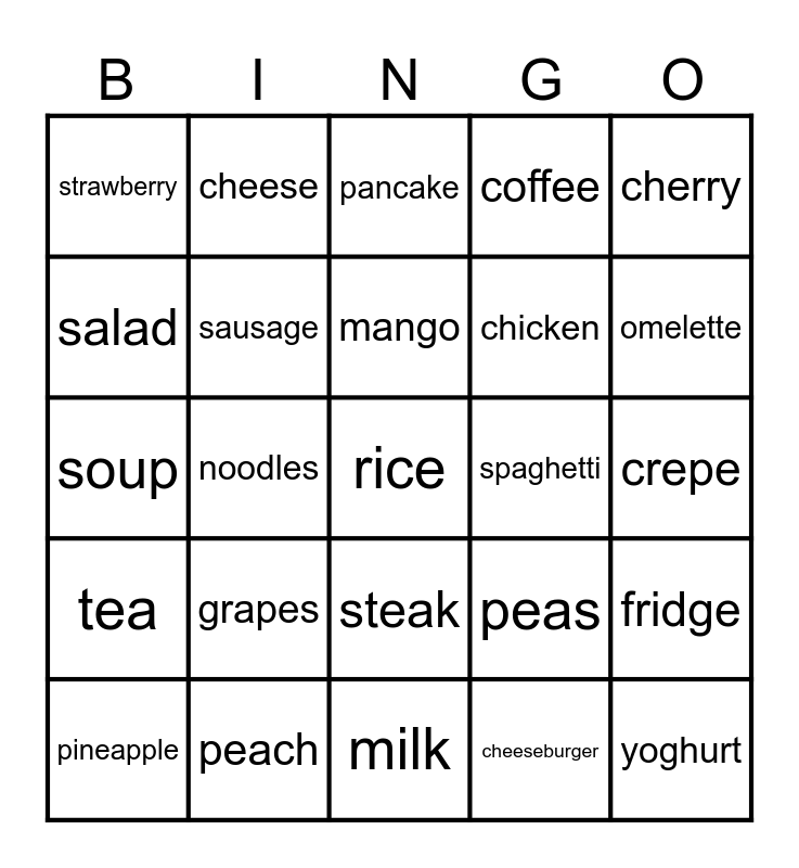 This bingo card has a free space and 24 words: grapes, peach, mango, pineapple, cherry, strawberry, salad, cheese, spaghetti, steak, chicken, soup, peas, fridge, sausage, cheeseburger, crepe, pancake, omelette, noodles, yoghurt, tea, coffee and milk.