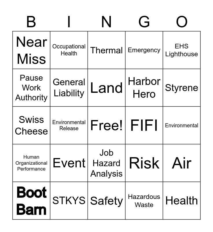 This bingo card has a free space and 29 words: Boot Barn, Contractor, Environmental Release, Injury/Illness, Near Miss, Thermal, General Liability, Event, FIFI, STKYS, Environmental, Health, Safety, Hazardous Waste, Styrene, Respiratory Protection, Job Hazard Analysis, Human Organizational Performance, EHS Lighthouse, Swiss Cheese, Risk, Hazard, Harbor Hero, Pause Work Authority, Emergency, Occupational Health, Air, Land and Water.