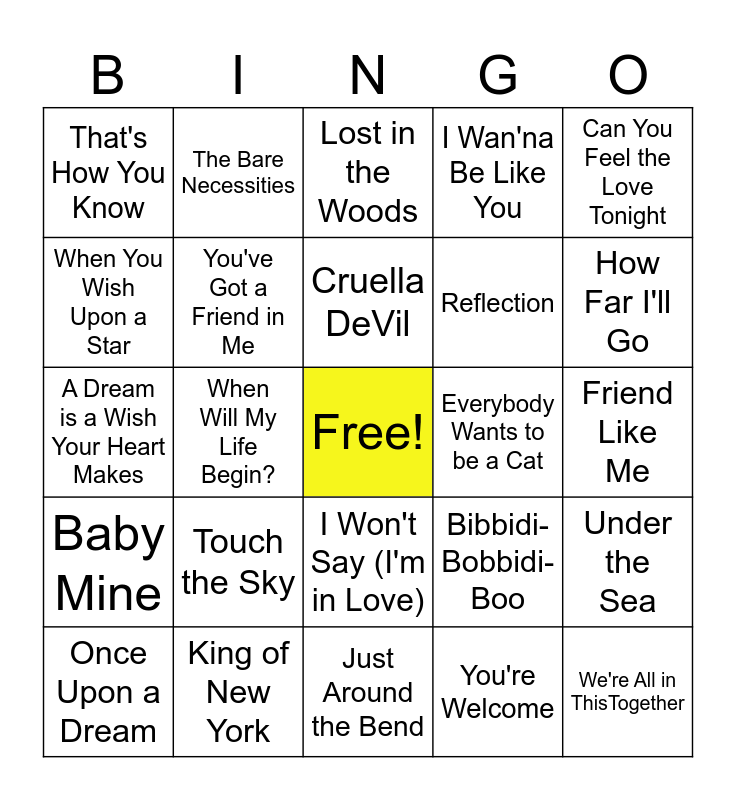 This bingo card has a free space and 48 words: Kiss The Girl, We're All in ThisTogether, Gaston, Just Around the Bend, Touch the Sky, A Whole New World, The Bare Necessities, Let It Go, When You Wish Upon a Star, Be Our Guest, You've Got a Friend in Me, I Wan'na Be Like You, Under the Sea, Bibbidi-Bobbidi-Boo, Heigh-Ho, Hakuna Matata, Cruella DeVil, Everybody Wants to be a Cat, The Wonderful Thing About Tiggers, Can You Feel the Love Tonight, When Will My Life Begin?, You're Welcome, That's How You Know, Reflection, Life's a Happy Song, How Far I'll Go, Once Upon a Dream, A Spoonful of Sugar, I Won't Say (I'm in Love), Baby Mine, I See the Light, Colors of the Wind, Why Should I Worry, Almost There, King of New York, A Cover is Not the Book, If I Didn't Have You, Friend Like Me, Best of Friends, Candle on the Water, Hawaiian Roller Coaster Ride, Oo-De-Lally, Lost in the Woods, Remember Me, A Dream is a Wish Your Heart Makes, Trashin' the Camp, Let's Go Fly a Kite and It's A Small World.