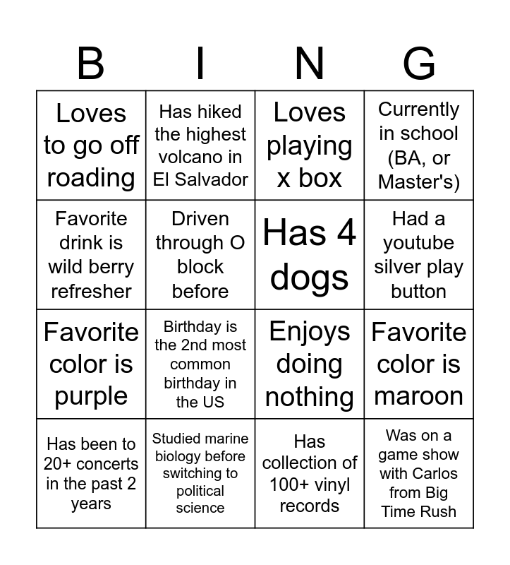 This bingo card has 20 words: Favorite color is maroon, Favorite Hobby: crochet small items, Loves playing x box, Enjoys collecting records, Has been to 20+ concerts in the past 2 years, Favorite drink is wild berry refresher, Studied marine biology before switching to political science, Loves to go off roading, Favorite color is purple, Has hiked the highest volcano in El Salvador, Birthday is the 2nd most common birthday in the US, Enjoys doing nothing, Driven through O block before, Was on a game show with Carlos from Big Time Rush, Has 4 dogs, Find of The Hobbit, Had a youtube silver play button, Currently in school (BA, or Master's), Has collection of 100+ vinyl records and Has never been on an airplane.