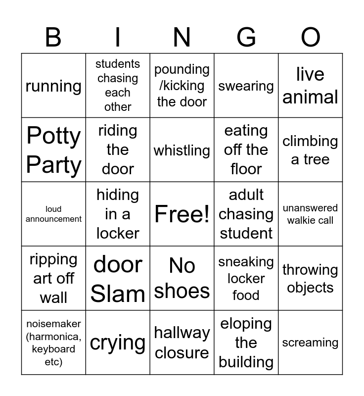 This bingo card has a free space and 24 words: door Slam, crying, whistling, noisemaker (harmonica, keyboard etc), live animal, running, Potty Party, students chasing each other, adult chasing student, No shoes, eating off the floor, loud announcement, sneaking locker food, throwing objects, riding the door, eloping the building, unanswered walkie call, pounding /kicking the door, climbing a tree, hiding in a locker, screaming, ripping art off wall, swearing and hallway closure.