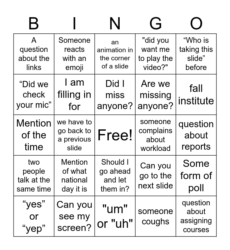 This bingo card has a free space and 24 words: Mention of what national day it is, Can you see my screen?, Did I miss anyone?, “yes” or “yep”, “Who is taking this slide” before, A question about the links, “Did we check your mic”, Someone reacts with an emoji, someone complains about workload, Should I go ahead and let them in?, Are we missing anyone?, Mention of the time, Can you go to the next slide, Some form of poll, I am filling in for, someone coughs, question about reports, an animation in the corner of a slide, fall institute, we have to go back to a previous slide, question about assigning courses, two people talk at the same time, "did you want me to play the video?" and "um" or "uh".