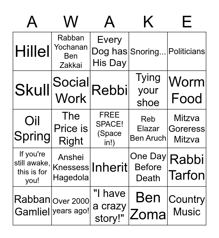 This bingo card has a free space and 24 words: Anshei Knessess Hagedola, Over 2000 years ago!, Rebbi, Rabban Gamliel, Politicians, Hillel, Skull, Rabban Yochanan Ben Zakkai, Reb Elazar Ben Aruch, Inherit, Tying your shoe, Oil Spring, One Day Before Death, Rabbi Tarfon, Social Work, Ben Zoma, Mitzva Goreress Mitzva, Every Dog has His Day, Worm Food, The Price is Right, Country Music, If you're still awake, this is for you!, Snoring... and "I have a crazy story!".