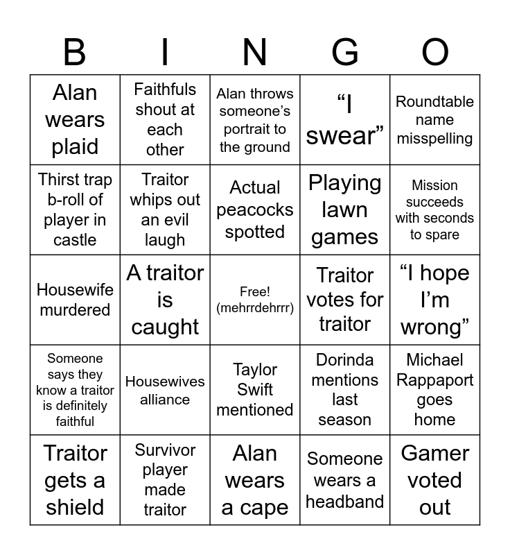 This bingo card has a free space and 33 words: Fergus š, Faithful wrongly banished, A traitor is caught, ā100% Faithfulā, Someone says they know a traitor is definitely faithful, Traitor whips out an evil laugh, Roundtable name misspelling, Traitor gets a shield, Faithfuls shout at each other, Someone cries, Actual peacocks spotted, Alan throws someoneās portrait to the ground, Mission fails, Players flirt with each other, Traitor votes for traitor, Mission succeeds with seconds to spare, Survivor player made traitor, Housewife murdered, Housewives alliance, Dorinda mentions last season, Taylor Swift mentioned, Eggs are mentioned at breakfast, Alan wears plaid, āI hope Iām wrongā, Alan wears a cape, Gamer voted out, āI swearā, Playing lawn games, Thirst trap b-roll of player in castle, Michael Rappaport goes home, Bugs/insects challenge, Someone wears a headband and Mauraās accent requires subtitles.